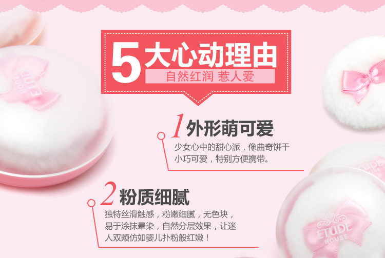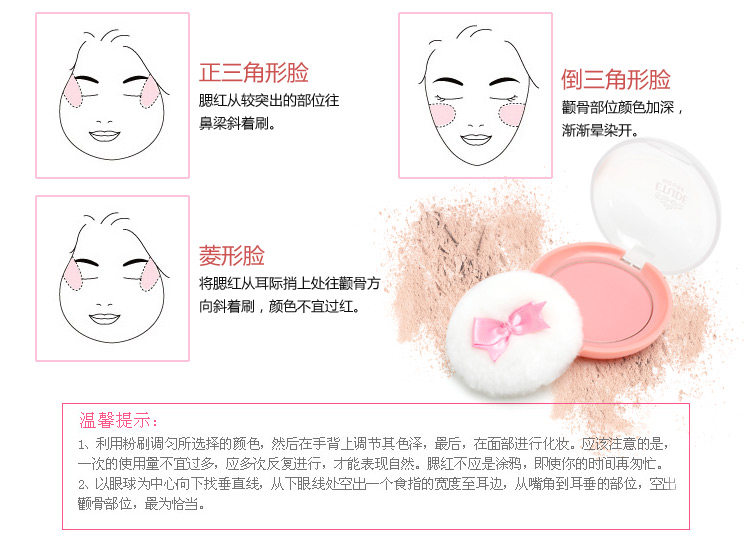 粉扑的触感N好哦.也超可爱~嘿嘿,彩妆生手也可以轻易搞定,轻轻的在笑肌上圆圆滴一扑.就美美的呢
