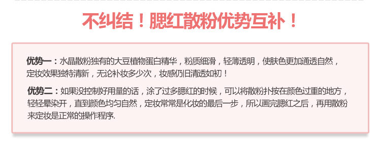 加上輕巧柔觸的腮紅粉撲設計,包覆細緻頰彩粉末,可輕易控制顏色暈染範圍,輕拍於兩頰更襯托出白皙肌膚的紅潤氣色!添加吸油粉粒,更長效維持美麗妝容。