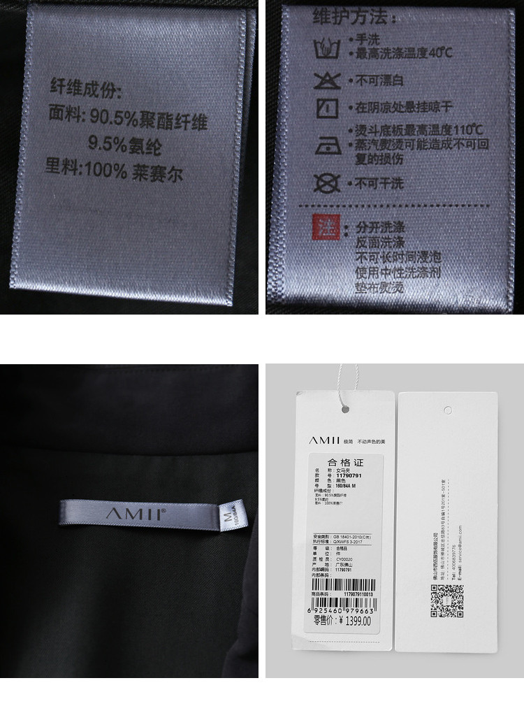 | 洗涤标准: | 悬挂晾干不可干洗不可漂白不可浸泡110℃以下垫布熨烫40℃以下手洗 |