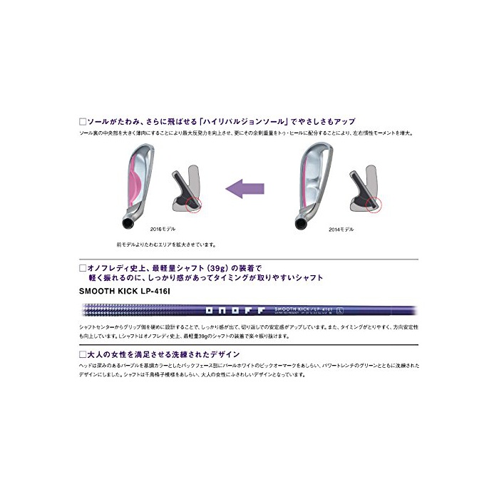 원본상품명: ONOFF(オノフ) IRON LADY レディス アイアン 品 SMOOTH KICK LP-416I シャフト フレックス:A 番手:#6 OFLP416I6A 右利き用 ロフト角:28度 番