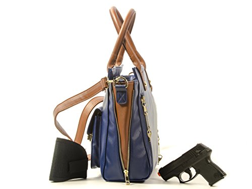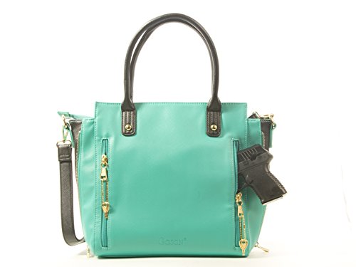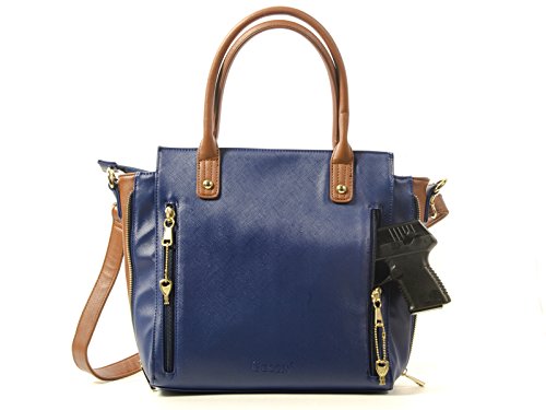-. Brand : Goson -. Department : womens -. Feature : Stylish two tone concealed carry purse crafted using Saffiano faux leather / All Gold tone metal hardware; 2 YKK locking zipper for conceal compartment / Both sides accessible locking conceal compartment includes 2 keys for each lock / Adjustable and convertible cross body strap included; drop distance 22 inch / 1 twist lock front compartment; 1 conceal compartment; 5 interior compartment -. ProductGroup : Shoes -. ProductTypeName : HANDBAG -. Title : Goson Concealment Gun Purse Cross Body Tote Bag