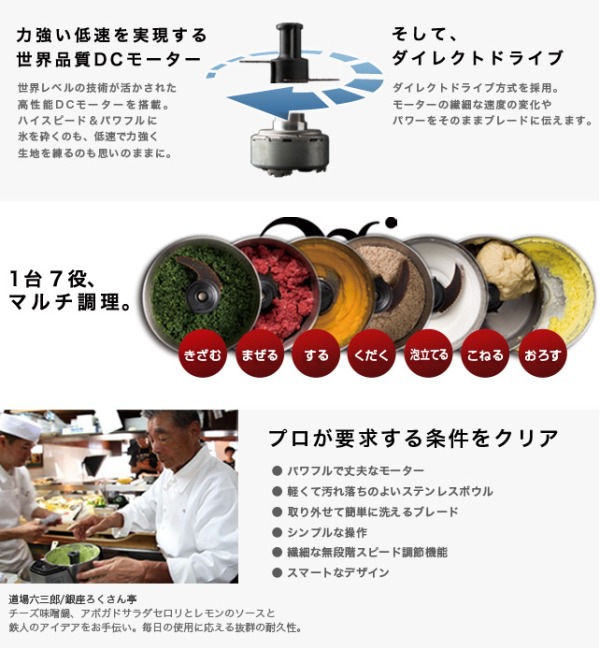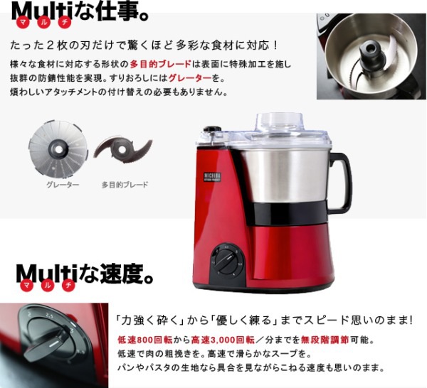 ●きざむ/する/まぜる/くだく/あわだてる/こねる(ブレード)/おろす(グレーター)の1台7役。