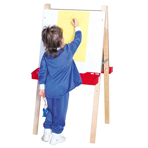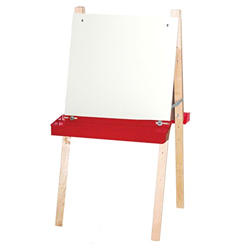 The Wood Designs WD18925 double-sided easel has a marker board and plastic tray on each side. It has hinged legs and measures 46 x 24 x 24 inches (H x W x D). (H is height, the vertical distance from lowest to highest point; W is width, the horizontal distance from left to right; D is depth, the horizontal distance from front to back.) The preassembled unit is made of plywood with eased edges and corners for safety and has an ultraviolet (UV)-resistant natural finish that also resists stains and damage from cleaning solutions. This double-sided easel is Underwriters Laboratories (UL) Greenguard Gold certified for environmental safety and is suitable for use in an educational environment.