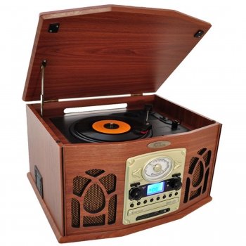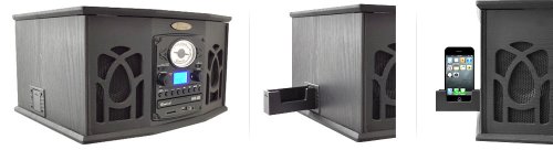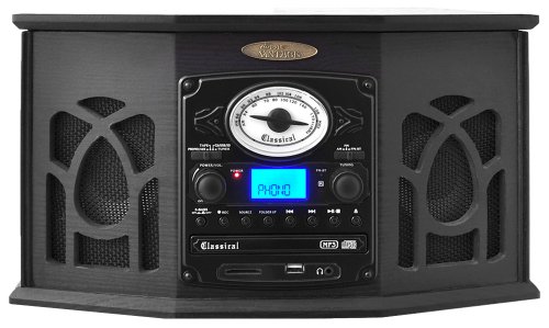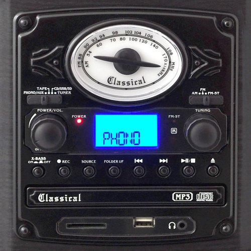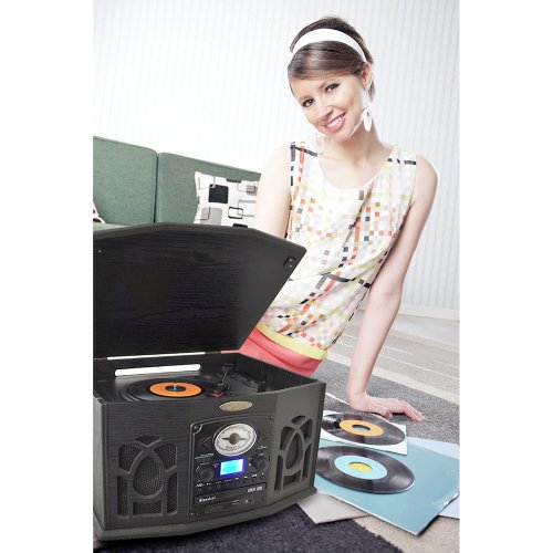 Get that classic jukebox look updated with modern technology with the PTCDS7UIB. This player does it all 3-speed vinyl, CD, digital MP3 playback with USB and SD cards, AM/FM radio, and even a cassette player! This jukebox will handle media from almost every generation of the 20th century. Plus, you can even convert your old vinyl and cassettes to digital MP3 files using this player. And with a 3.5mm auxiliary input jack, you can also connect your iPod, iPhone, iPad, Android cell phone, or virtually any other digital music player with a headphone jack. This retro turntable includes old-school details like a dial-scale radio with amber backlight and rotary volume control but also has new-school additions like a headphone jack, LCD display, and bass-boost technology for rich, booming bass. For the ultimate combination of old and new, there's Pyle Vintage. Color: black.Feature