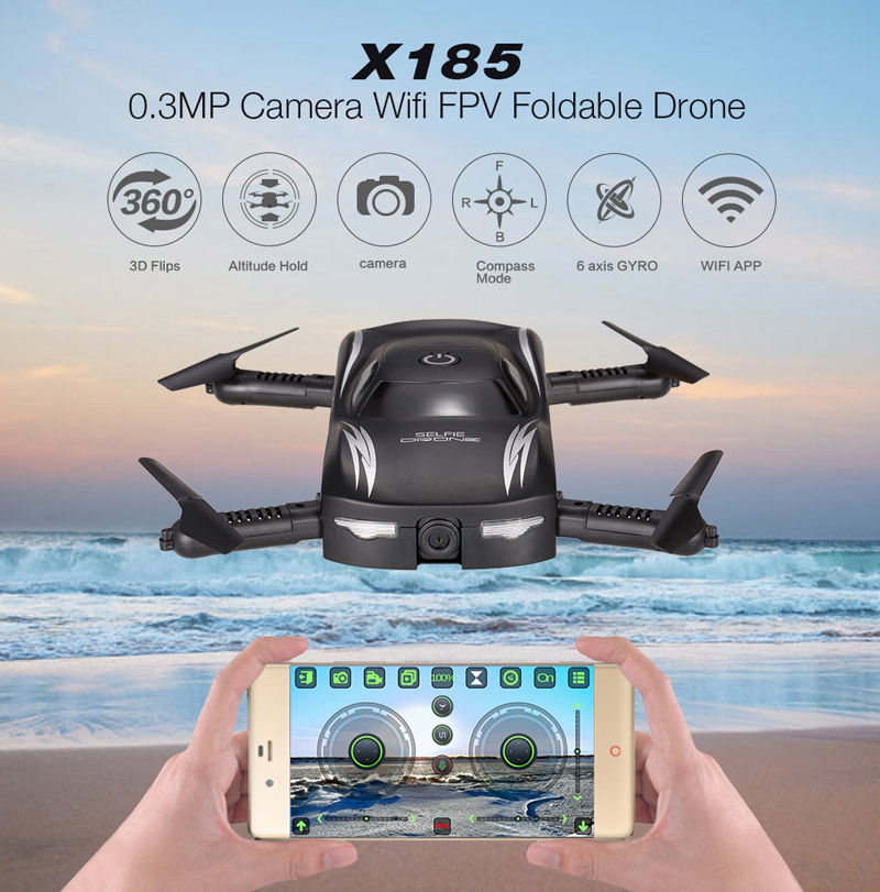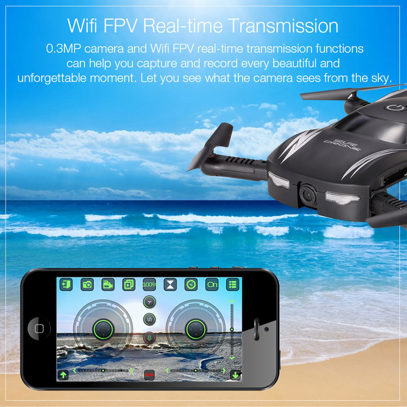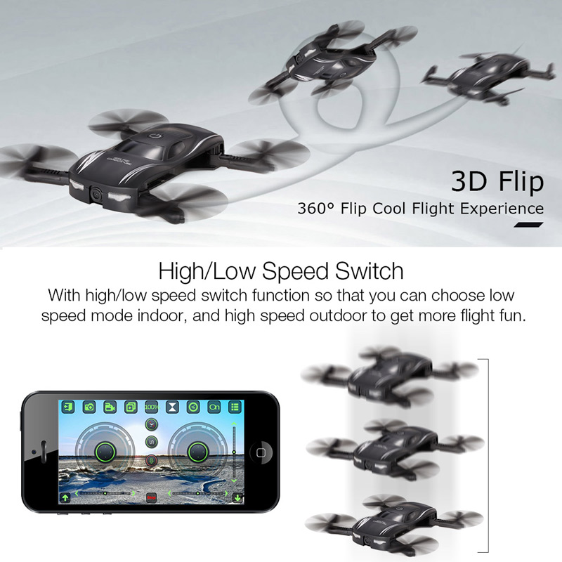 This WiFi FPV foldable pocket drone is super unique in its appearance. Have a look, you will love it. The barometer set height and built-in six-axis gyro functions that will promise you a stable flight. With 0.3MP camera and Wifi real time transmission, you can enjoy a wonderful flying experience.