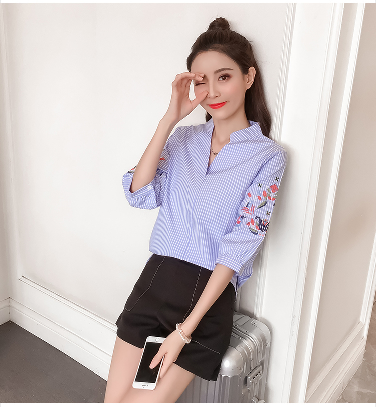 爽やかなブルーのストライプが春にピッタリな七分丈シャツ☆