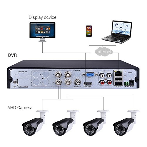 -. Feature : Analog High Definition AHD HVR DVR, camera with 1/3" CMOS Sensor 2.0MP Full HD 1080p Resolution (1920x1080), 3.6mm Fixed Lens, Low Illumination WDR, DNR, UTC, With IR-CUT,42IR Sensors with a Nigh Vision Distance of 100 Feet. IP66 Weatherproof and Vandal Proof Can be Installed Outdoors in Extreme Weather Conditions. / Includes 4 x HD 2.0Mega Pixels IP66 professional CCTV cameras capable of 1920 x 1080p video, each with a 3.6mm lens and wide 75 Degree viewing angle. View and record with remote viewing on standard web browsers as well iPhone, iPad and Android devices. / Plug and Play in Seconds: DVR supports full 1080P AHD video input, plug in the camera, download app under the same wifi network video security camera system indoor, login as visitor firstly, add the device in just minutes. Connected to a monitor with HDMI/VGA port video output port as tv camera system , multiple recording modes and playback, power on and work automatically, never miss any precious moment of your loved ones. / Remote viewing Simple and Reliable: Free download APP CamView, Quick QR Code Scan, Easy & Quick Remote Access, No more complicated DDNS and network configuration involved, Smart phone/Tablet view and remote access simultaneously, View anytime, anywhere via internet / Motion Detection Recording : Allows you record only when motion is detected so that you can save hard drive storage space without missing important events. Any movements can be detected and recorded and alert email sent timely to leave you enough time for precautions.