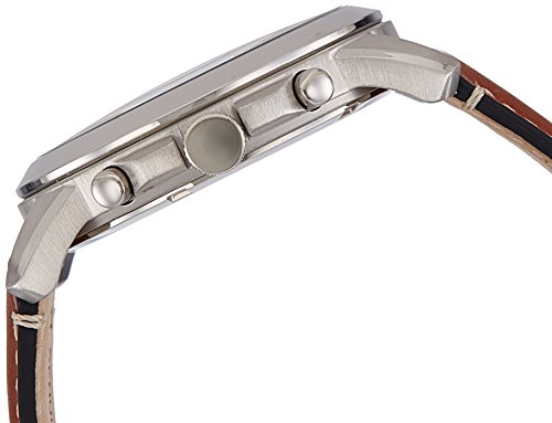 Sleek and stylish, this silvertone stainless steel watch features a light brown leather strap and classic black roman numerals against a beige dial.