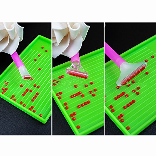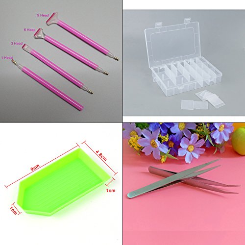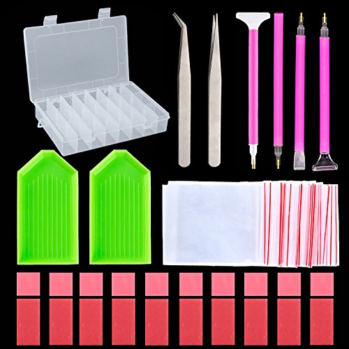 - Package includes:Transparent plastic storage box*1pcs,Seal diamond plate(green)*2pcs,4 different types of diamond sticky pen,2 different types of tweezers,Small clay*10pcs,Big clay*10pcs,PE bag*10pcs.A foundation tools set for diamond picture beginners and amateur.