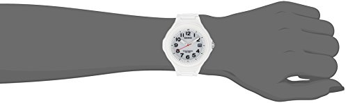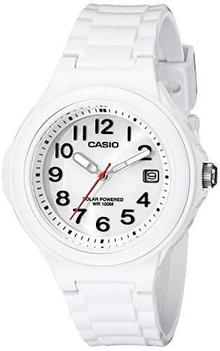 Solar-powered watch with white dial and black hour markers featuring date display at three o'clock