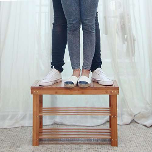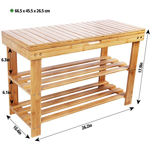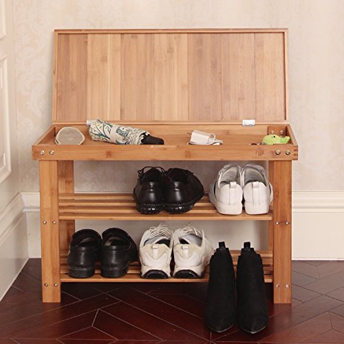 -. Feature : MULTIFUNCTIONAL: Made of 100% of natural bamboo.Not only a bamboo shoe rack, you can sit and put on your shoes. Use it as a plant stand or any other storage rack / EXTRA CONPARTMENT: On the top of bench has a storage space, you can place extra socks and paper shoe covers for guests, and store keys, shoe lifter, insoles, brush etc. A stick can help you divide the samll things / EASY ASSEMBLE:Very easy to put together, only need 15~20 minutes to install it / STURDY&DURABLE:This storage bench durable and solid, sturdy enough to hold a person weight about 250 lbs / SMART DESIGN & USEFUL: It's suitable for a variety of decoration style, has a perfect size to put in the entryway,dining room,living room etc..It can contains 6~8 pairs of shoes