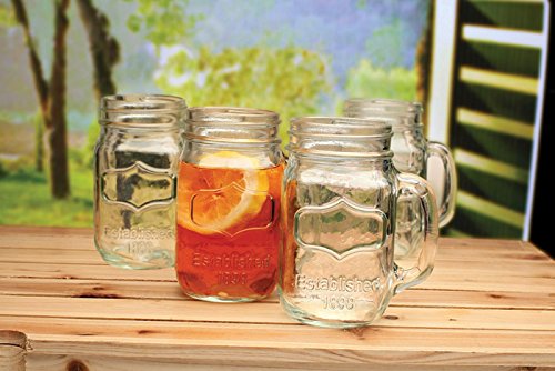 A future heirloom. Not your grandma's Mason jars. Perfect for old-fashioned iced tea, lemonade, or any refreshing drink. Attractive and sturdy with vintage charm galore. Go back to the days of listening to the wireless and drinking moonshine. Set of four glasses, each shaped like a Mason jar, but with an easy-to-hold handle. Lead-free. Dishwasher safe.Feature