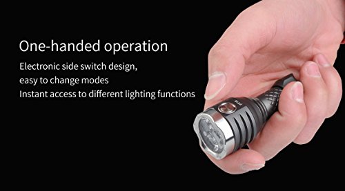 One handed operation. The electronic side switch design makes it easy to turn the flashlight ON and OFF and to change to the 5 different modes (Turbo, High, Medium, Low, and Strobe). The user has instant access to the Turbo and the Strobe mode.