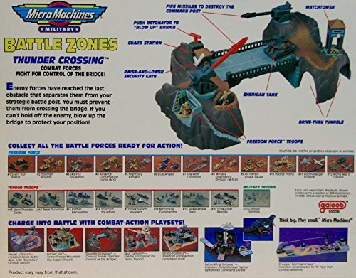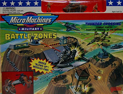 - Feature : Micro Machines Thunder Crossing Military Play Set! / From the Battle Zones Series! The Original Scale Miniatures! The Approximate size of a Micro Machines vehicle is 1.5 inches long! / Combat Forces Fight for Control of the Bridge! Bridge "Blows Up"! Missiles Fire! / Includes Watchtower, Drive Thru Tunnels, Security Gate, Guard Station and More! / Includes Micro Machines Sheridan Tank Vehicle!