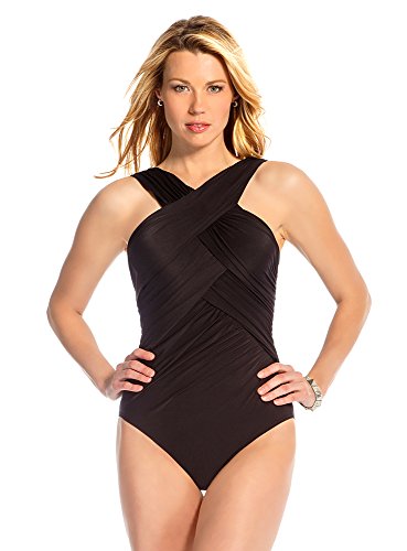 Express yourself in our most daring design in the Miraclesuit Too Haute Crisscross Highneck Swimsuit. This feminine, wrapped style begins with a crisscrossed neckline meeting at a full straight, supportive back. A soft cup bra and distinct front shirring mean serious business when keeping your curves intact as tummy-taming, waist-whittling and hip-hiding features sparkle in our new favorite silhouette.Feature