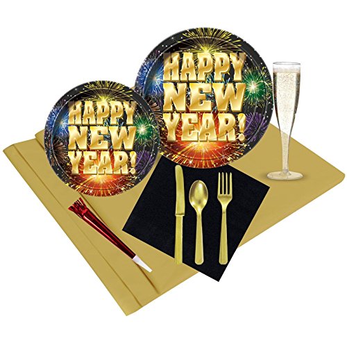 -. Feature : Includes (24) Dinner Plates, (24) Dessert Plates, (24) Champagne Flutes, (50) Luncheon Napkins, (32) Beverage Napkins, (24) Forks, (24) Spoons, (20) Party Favors, and (1) Gold Tablecover / Add matching decorations and wearables to help you and your guests usher in the New Year in style.