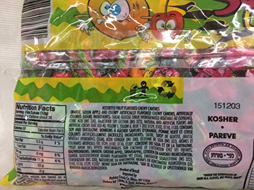 -. Feature : Kosher Fruit Flavored Sour Chews / 16 ounce per bag (total of 64 oz.) / Green Apple, Cherry and Orange Flavors / Kosher Certified under Rabbi Illowitz