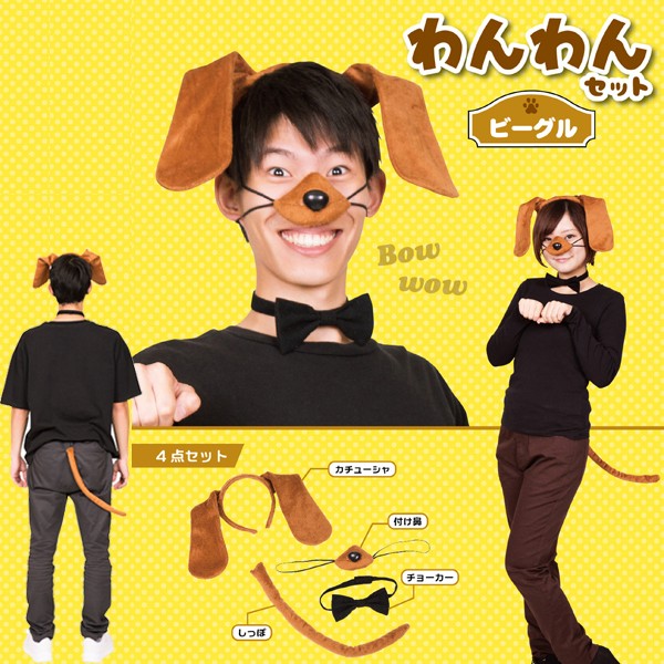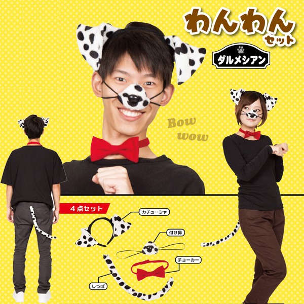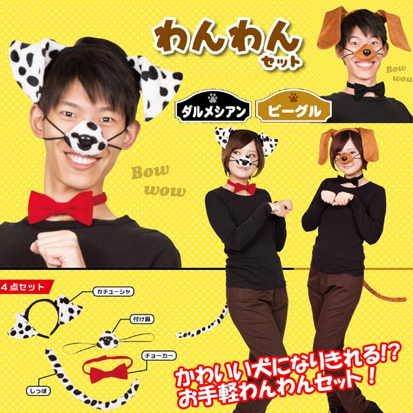 めでたい!!戌年!かわいい犬になりきれる!?お手軽わんわんセット!忘年会、新年会、余興、パーティーの盛り上げに!チョーカー付きでオシャレな犬コスプレセット!カチューシャはワイヤー入りでリアルな垂れ耳の形を再現しています。付け鼻やしっぽもついていてなりきり度は高め!!かわいいビーグル、ダルメシアンになりきろうワン!■セット内容:カチューシャ、付け鼻、チョーカー、しっぽ(安全ピン)