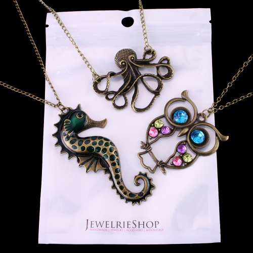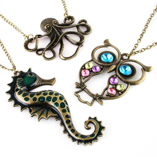 - Feature : Retro, vintage style / Antique bronze finish / Long Alloy Chain / 3x Mixed Vintage Gold Owl Pendant / Octopus / Seahouse / Different Designs Available