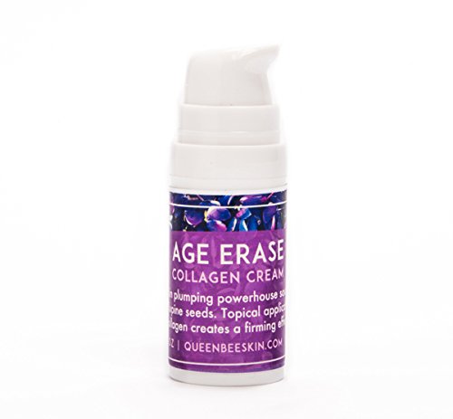 -. Binding : Misc. -. Brand : Queen Bee Organic Skin Care -. EAN : 0753640540626 -. Feature : Collagen Cream sourced from wildflowers / container holds .33 oz of product by volume or .6 oz by weight. watch Queenie talk: https://youtu.be/zF5VuUZFQts / In our study, 25 ladies tried Age Erase collagen cream for 90 days. We looked at elasticity and snap using a cutometer. he skin is lifted, stretched and then released. These deflections are optically recorded and evaluated. In our group we showed an improvement of 10% over the entire group. We noticed less sagging of skin and when asked 92% of them noticed an improvement in firmness and 72% noticed a reduction of facial sagging. -. IsAdultProduct : 0 -. Label : Queen Bee Organic Skin Care -. Manufacturer : Queen Bee Organic Skin Care -. MPN : age_erase_airless -. PackageQuantity : 1 -. PartNumber : age_erase_airless -. ProductGroup : Beauty -. ProductTypeName : BEAUTY -. Publisher : Queen Bee Organic Skin Care -. Studio : Queen Bee Organic Skin Care -. Title : Organic Collagen Cream Age Erase Queen Bee Skin Care Vegan sourced from wildflowers -. UPC : 753640540626