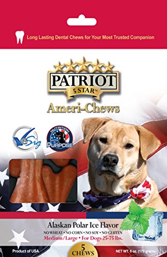 -. Binding : Misc. -. Brand : Patriot -. EAN : 0857785005207 -. Feature : Made in USA / A Portion of Every Sale Goes to Promote Service Dogs in America / Cleans teeth / Freshens Breath / Grain Free -. Label : Simplicty Pet -. Manufacturer : Simplicty Pet -. PackageQuantity : 1 -. ProductGroup : Pet Products -. ProductTypeName : PET_SUPPLIES -. Publisher : Simplicty Pet -. Studio : Simplicty Pet -. Title : Patriot 5 Star Ameri-Chews: Alaskan Polar Ice for Med/Large Dog -. UPC : 857785005207
