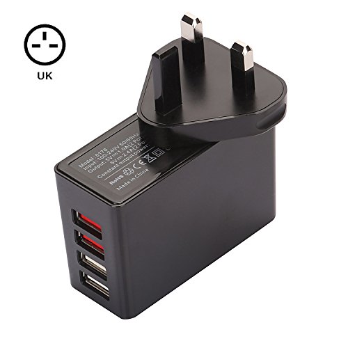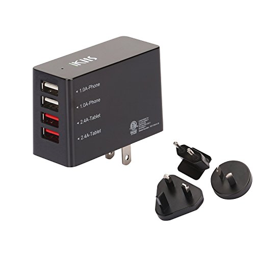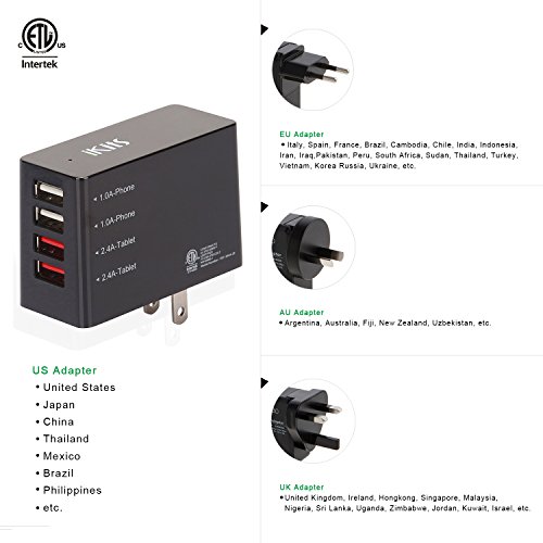 iKits (CB, ETL Certified) 4-Port 6.8A USB Wall Charger/International Charger, 2 Port Fast Charge+2 Port 1A, with Smart IC Technology for iPhone/iPad & More universal US AU UK EU Plug Adapter (Black)