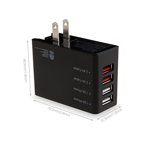 Strong Power: 4 ports support 34 watts(6.8A) of power, enabling simultaneously 4 devices charging. 2 ports deliver 1A, 2 ports deliver 2.4A max charging current