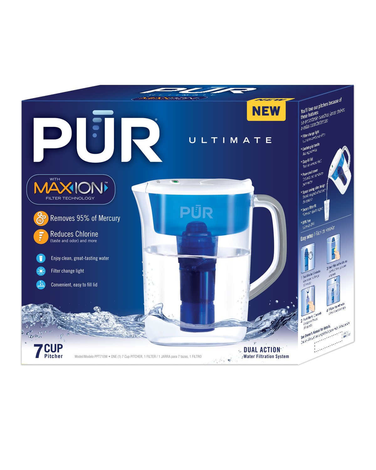 PUR 18-Cup Water Filter Dispenser Narrow, sleek design; fits neatly in refrigerator or sink for refilling Advanced filtration system; reduces more contaminants than other pour-through filters Filter-life gauge indicates when filter needs to be replaced Handles make it easy to fill and carry