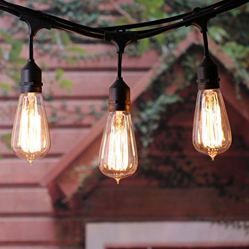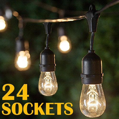 48Ft Outdoor Weatherproof String Lights with 24 Sockets E26 Base & 26 11W S14 Warm Bulbs, Commercial Grade Heavy Duty Light String for Patio, Bistro, Backyard, Black