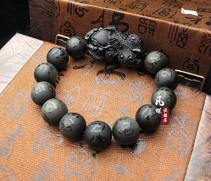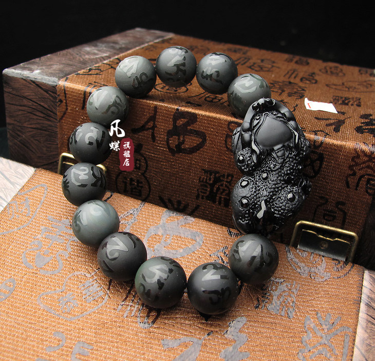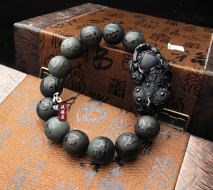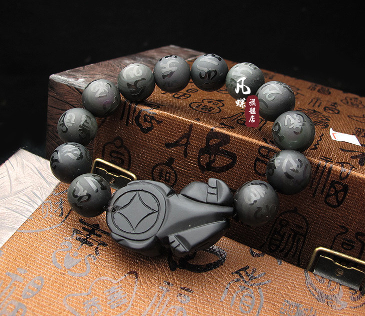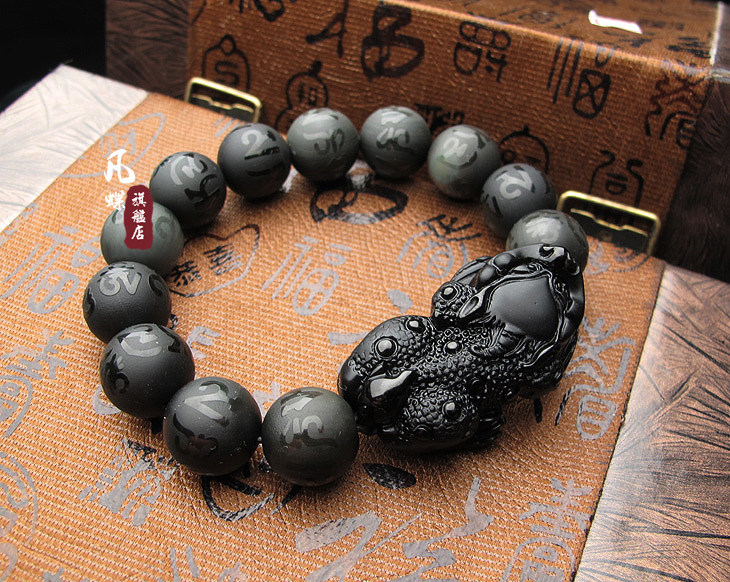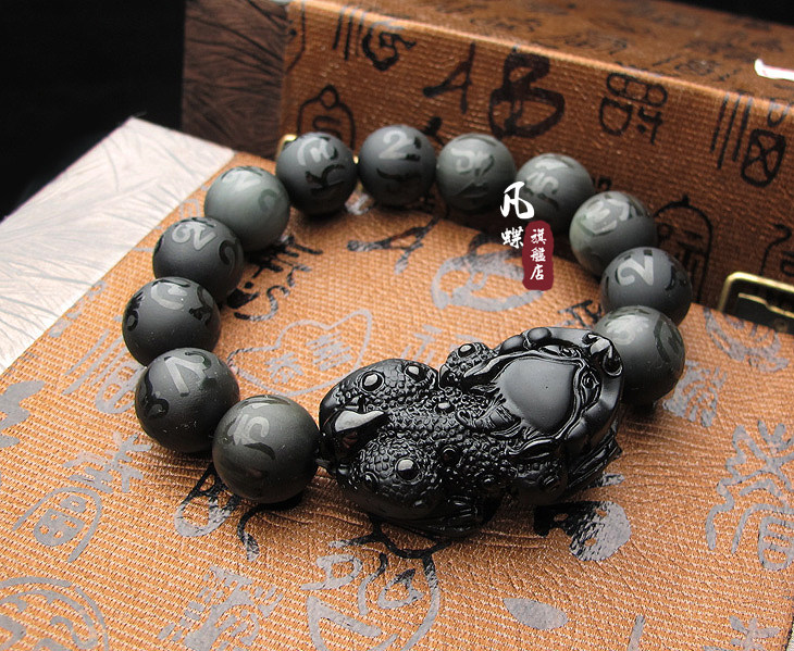 开光黑曜石貔貅手链六字真言转运三蟾赐福金禄得宝手链男士款