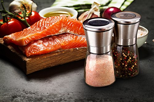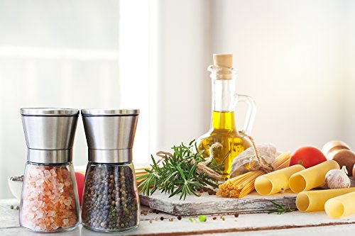 PREMIUM KITCHEN HARDWARE: Set of 2 mills are crafted from premium stainless steel cover, high quality glass body and non-corrosive ceramic grinder for ensuring food safe as well as stand with you for a long time.