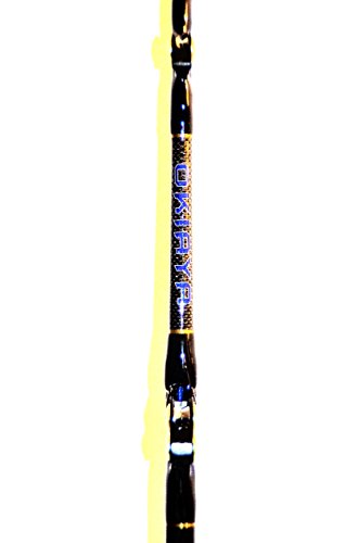 Genuine OKIAYA OFFSHORE VENOM PRO CARBON FIBRE 80-130LB. Class Rod These are black blanks with royal blue and gold trim. All rods individually wrapped in a protective sock with our custom OKIAYA label. FIVE roller guides and 5'6" long for IGFA standup fishing Royal blue and black with gold trim Perfect for offshore trolling and fishing for Dolphin, Wahoo, and Tuna Featuring a classic design with use of CNC machined aircraft grade alloys for strength Composite fiber main shaft for superior sensitivity Super smooth rollers and durable hardware that keeps it looking good Sensitive tip to feel the bite and a real "bull dog" backbone for the fight of your life EVA foam grip and slick butt handle for fast and easy removal. Meets or exceeds all IGFA standards for all big game competitions Overall rod length 1.83M (6") OKIAYA rod cover included One piece heavy action Designed in the United States Four roller guides with a roller tip Premium grade Carbon Fiber blank Anodized aluminum reel seat Cross-cut aluminum gimbal butt 100% satisfaction or your money back! 2 Year warranty against any defects! Customer service: 410-463-5326 Worldwide leader in offshore fishing tackle.Feature