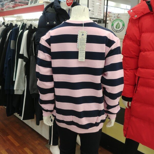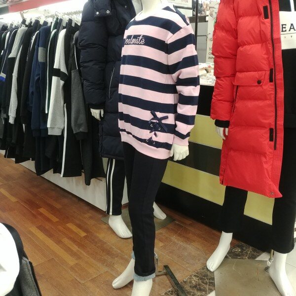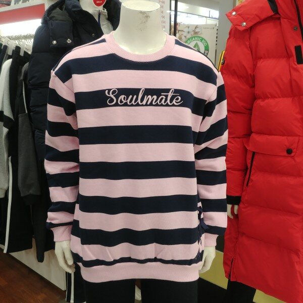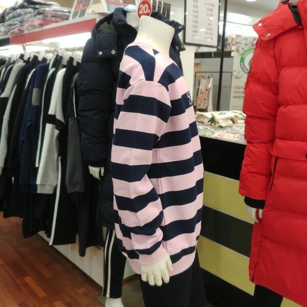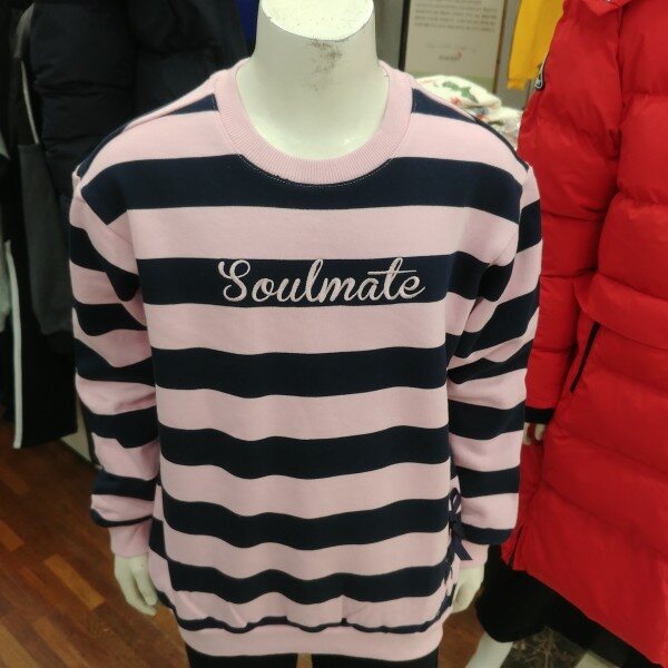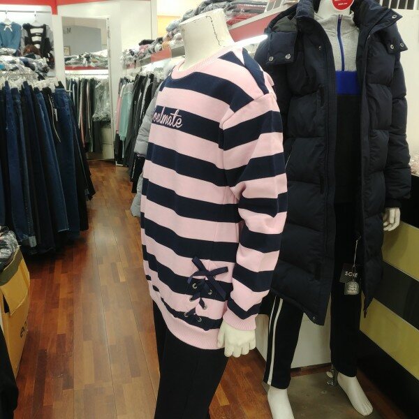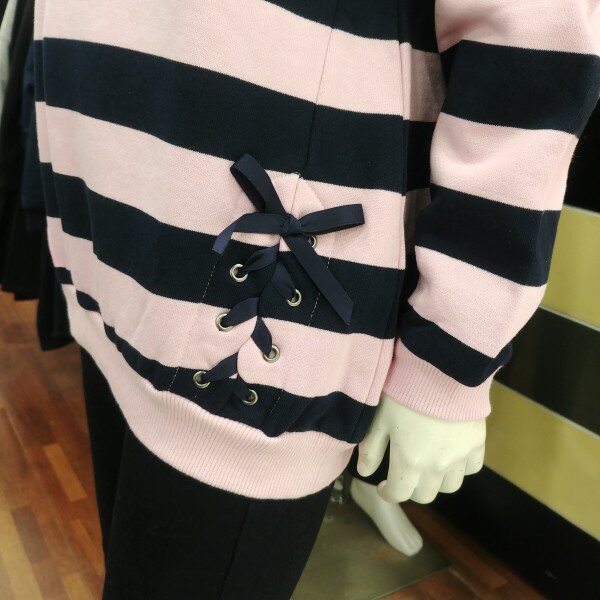 분홍 바탕에 곤색의 스트라이프..밑단 아래쪽에 지그재그 매듭묶음이 포인트입니다.