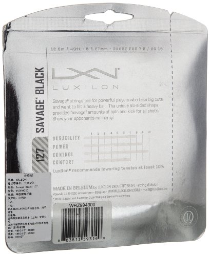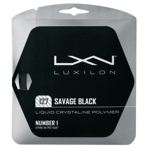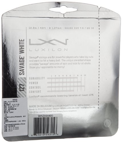 ReleaseDate : 2011-01-21 Studio : Wilson Publisher : Wilson Binding : Sports Product Description Luxilon Savage Lime 127 is a new 16L gauge, more economical poly option in the Luxilon family of strings and offers much of the tour-level durability and control expected from Luxilon. 6 sided shape for added spin and bite on the ball. Liquid Crystalline Polymer construction ensures that Savage Lime plays as well as it lasts, with excellent spin potential and tension maintenance. The all new liquid crystalline polymer string, Luxilon Savage Lime 127 offers enhanced control and spin over the professional tour favorite, ALU Power. Featuring a hexagonal cross section, this string bites the ball well for hard hitters wanting extreme topspin. The liquid crystalline polymer construction helps this string react best in the hands of strong players looking for excellent control. Savage Lime 127 plays in between the ALU Power and the Big Banger Original in terms of stiffness, while offering the greatest spin of any Luxilon string. Our playtesters felt that this string outperformed Babolat's RPM Blast in terms of spin generation and had a softer feel. They appreciated the control they were getting from the baseline and felt they could swing out without fear and dictate play. Recommended especially for strong, heavy topspin baseliners seeking a durable, control string that will generate even greater spin. Color: Lime Gauge: 1.27mm Length: 40Ft 0