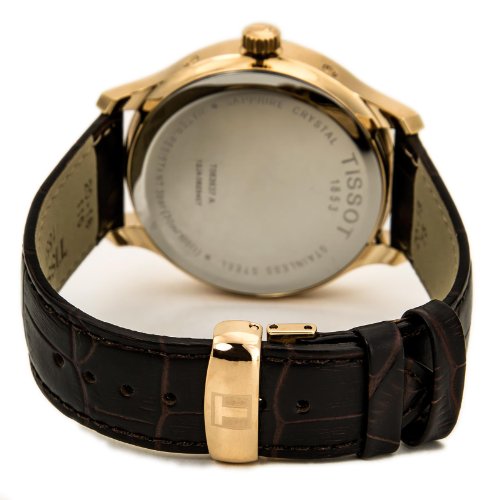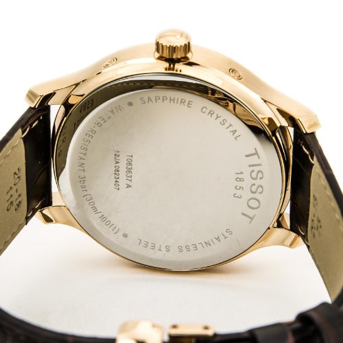 Studio : Tissot Publisher : Tissot Binding : Watch Product Description Rose gold-plated stainless steel case with a brown leather strap. Fixed rose gold-plated bezel. White dial with rose gold-tone hands and index hour markers. Arabic numeral marks the 12 o'clock position. Minute markers around the outer rim. Dial Type: Analog. Three multi-function displays: seconds, day of the week and month. Quartz movement. Scratch resistant mineral crystal. Solid case back. Case diameter: 42 mm. Case thickness: 11 mm. Round case shape. Band width: 20 mm. Butterfly clasp. Water resistant at 30 meters / 100 feet. Functions: date, day, month, hour, minute, second. Casual watch design. Tissot Tradition Perpetual Calendar Rose Gold-plated Mens Watch T0636373603700. 0