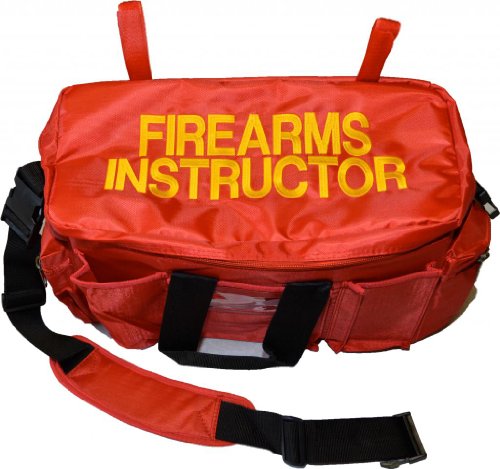 -. Binding : Apparel -. Brand : D&K Monogramming Apparel -. Department : unisex-adult -. Feature : Bag dimensions: 18" L, 13" H, 8.5" W / shoulder and hand carry strap / large interior with plastic divider / Lots of pockets, inside flap and outside / very sturdy and heavy duty nylon equipment bag -. Model : 7000-RED-FIRE/INS -. ProductGroup : Apparel -. ProductTypeName : BAG -. Title : Red Equipment Bag with Firearms Instructor embroidered in gold lettering