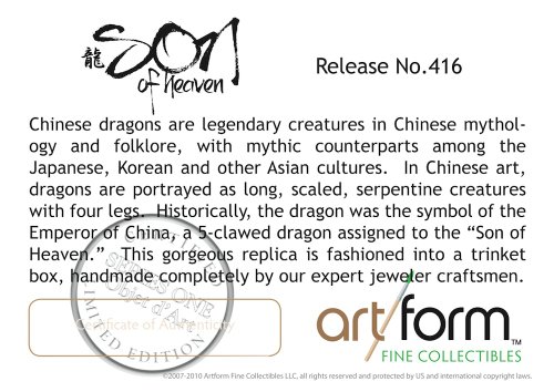 -. Binding : Misc. -. Brand : Objet d' Art -. EAN : 0696748054483 -. Feature : Made 100% by hand by expert metal handicrafters. / Beautifully boxed and includes certificate of authenticity, presentation gift card with matching envelope. / A beautiful, tasteful collectible. A gift worth giving and keeping for a lifetime. / Hand applied authentic Austrian crystal and European lacquers. / Part of the huge collection of jeweled trinket boxes from Artform Fine Collectibles. -. IsAdultProduct : 0 -. ItemPartNumber : AFOA10206 -. Label : Artform, LLC -. Manufacturer : Artform, LLC -. Model : AFOA10206 -. MPN : AFOA10206 -. PackageQuantity : 1 -. PartNumber : AFOA10206 -. ProductGroup : Home -. ProductTypeName : HOME -. Publisher : Artform, LLC -. Studio : Artform, LLC -. Title : Objet D'Art Release #416 "Son Of Heaven" Ancient Chinese Lucky Dragon Handmade Jeweled Enameled Metal Trinket Box -. UPC : 845277004081 -. Warranty : 90 day warranty against manufacturer defects