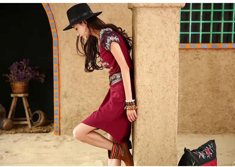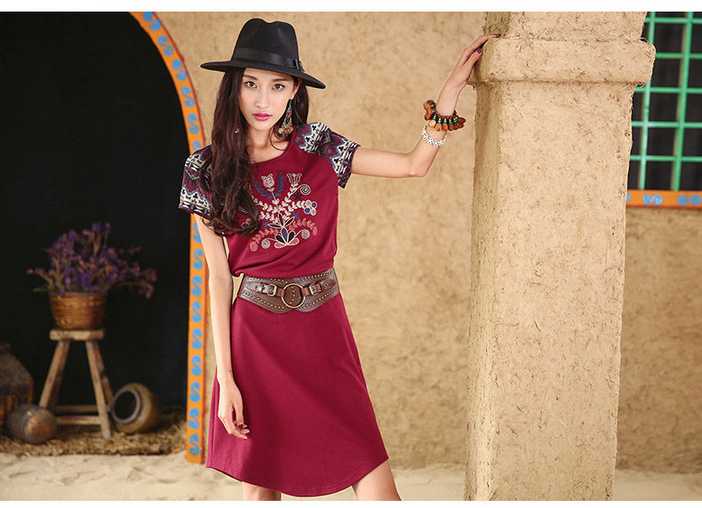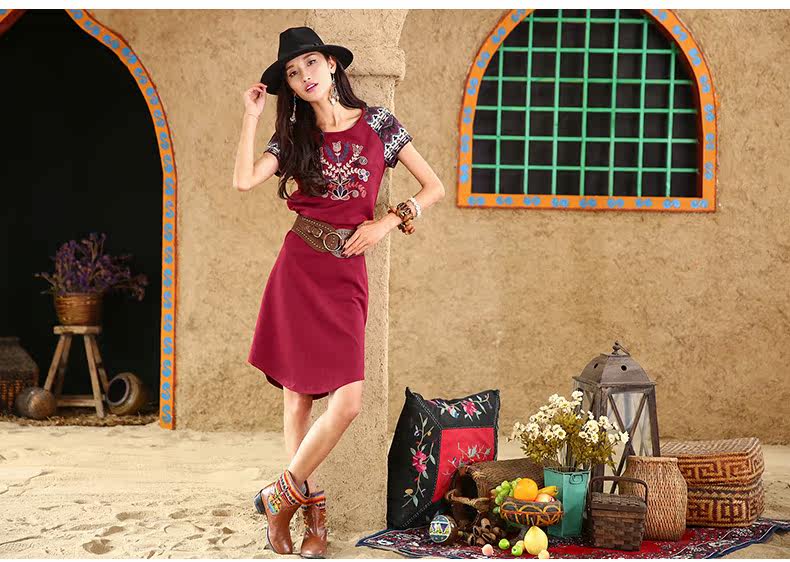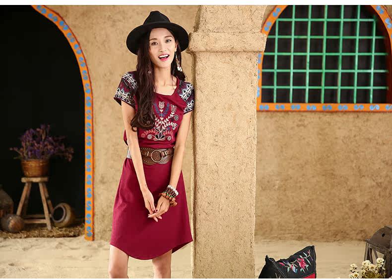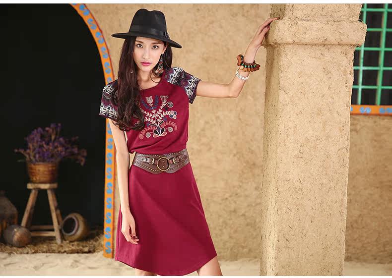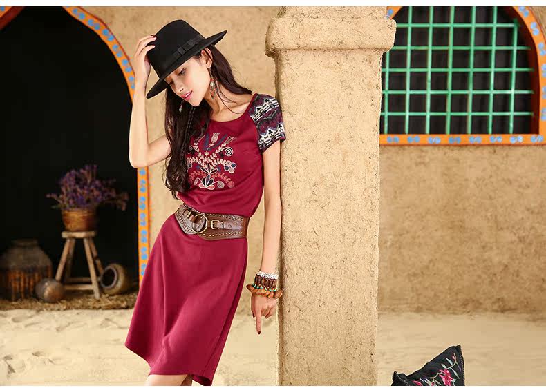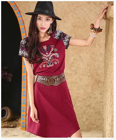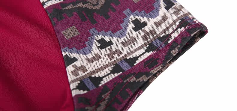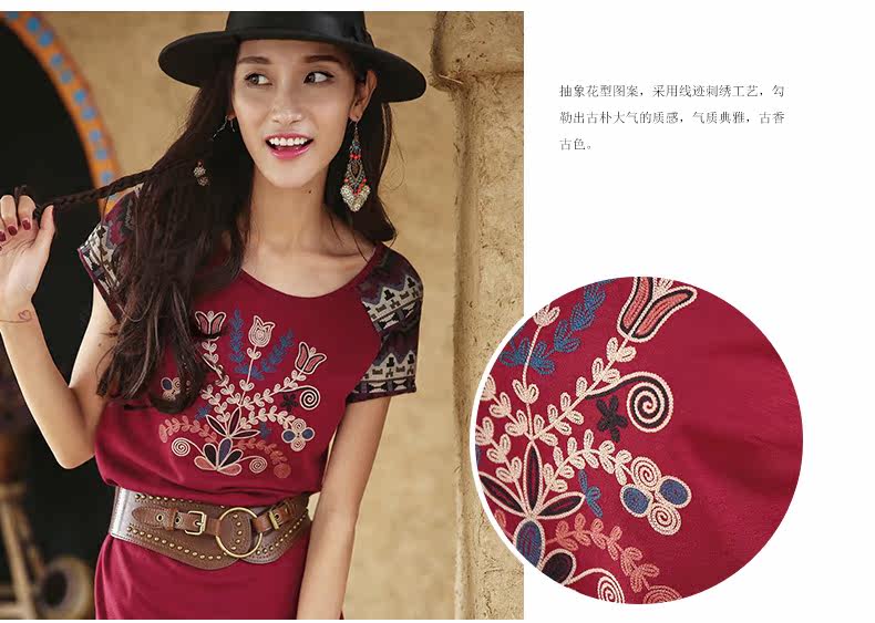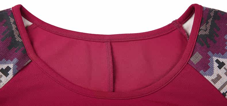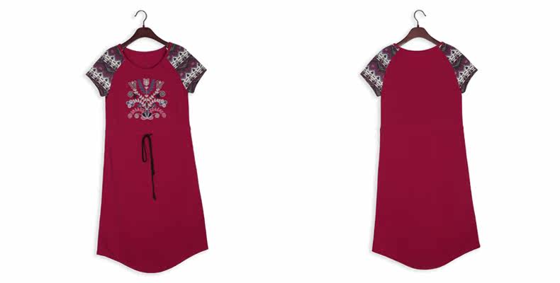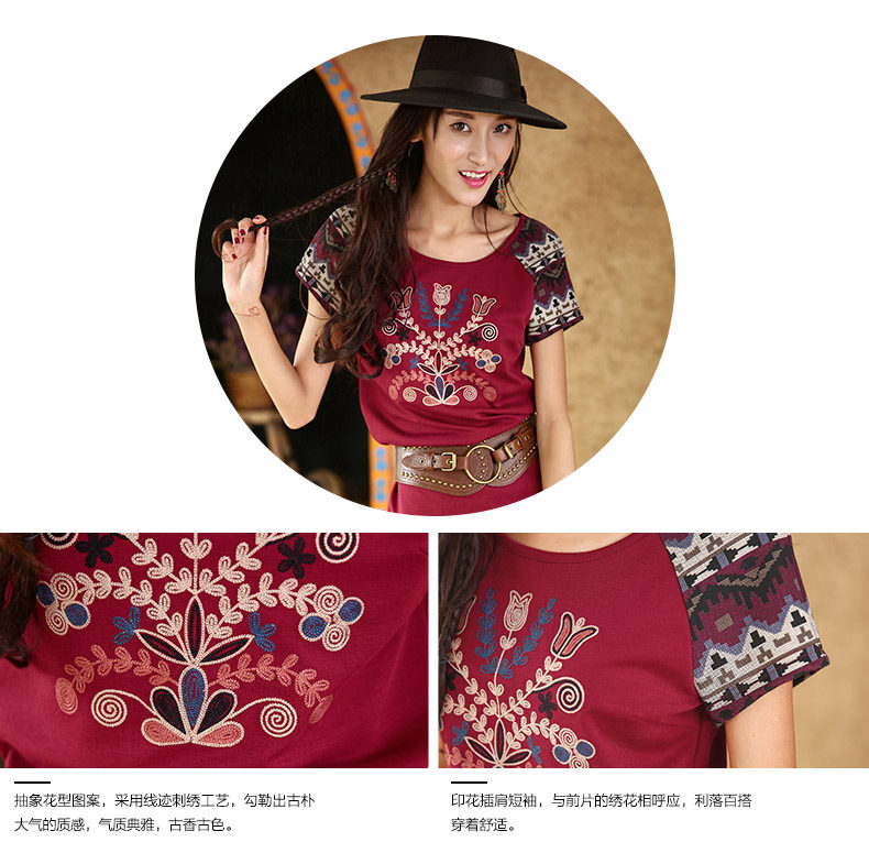 采用插肩短袖的设计,与绣花图案相呼应。 印花短袖