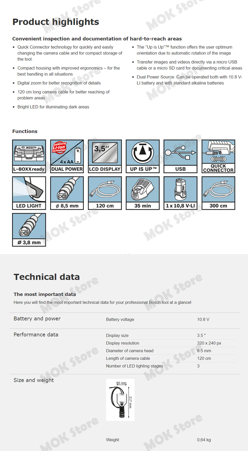 The new Bosch Compact Inspection Camera is the perfect tool for quick and easy inspections. The Compass View offers you optimum and constant orientation while in use, and a digital zoom to see details more clearly. This camera comes with a 120cm long camera cable, at 8.5 diameter it will get into any nook and crany around the house. Introducting the newest feature for Bosch Inspection Cameras, "Up is Up" function offers you optimum orientation with an automatic rotation of the image on the screen. This new feature makes inspecting even easier than before. You can transfer images from the camera using either USB cable or Micro SD cards.