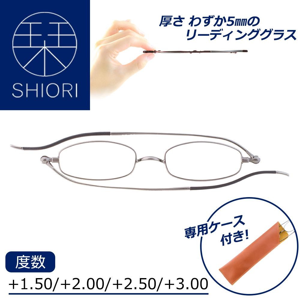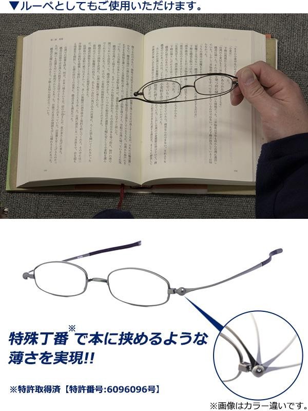 | 「栞(しおり)」には独特なテンプルの開閉方式を実現した、特殊丁番を採用しています。これによりテンプルを折りたたむと、まさに「しおり」のような薄さ!!上下に折りたたまれるテンプルは、それぞれ斜め方向に開閉します。 |