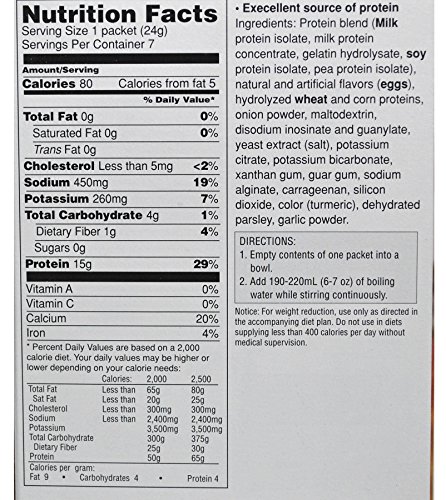 -. Binding : Health and Beauty -. Brand : ProtiWise - By Doctors Best Weight Loss -. EAN : 0753677575943 -. Feature : High in Protein - 15 grams Per Serving / Low Calorie - 80 Calories Per Serving / No Sugar / Sold in Many Weight Loss Centers - Medical Grade / FREE SHIPPING with all orders over $75! -. IsAdultProduct : 0 -. Label : Doctors Best Weight Loss -. Manufacturer : Doctors Best Weight Loss -. PackageQuantity : 7 -. ProductGroup : Health and Beauty -. ProductTypeName : HEALTH_PERSONAL_CARE -. Publisher : Doctors Best Weight Loss -. Studio : Doctors Best Weight Loss -. Title : ProtiWise - Cream of Chicken High Protein Diet Soup (7/box) -. UPC : 753677575943