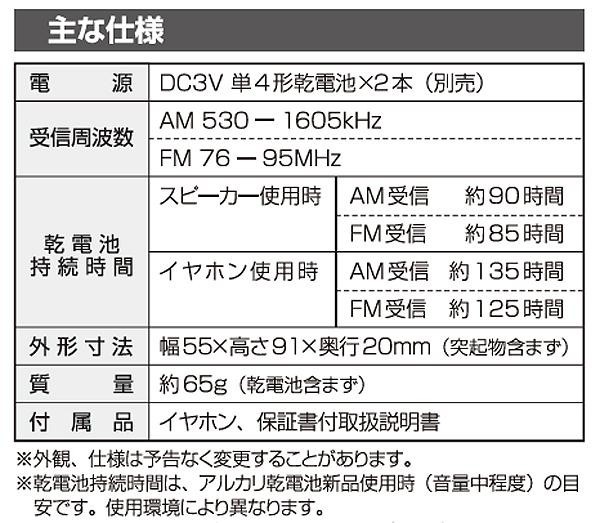 ワイドFM(FM補完放送)対応の高感度ラジオ。最大135時間持続の電池長持ちタイプ。ラウンドフォルムで持ちやすく、コンパクトだから携帯に便利!同調ランプが光ります。FMロッドアンテナ・モノラル受信・スピーカー搭載・イヤホン付属。 |