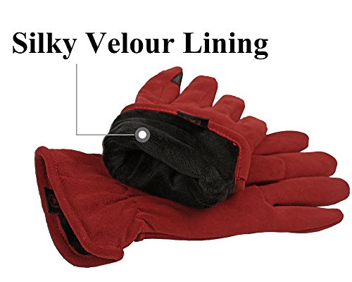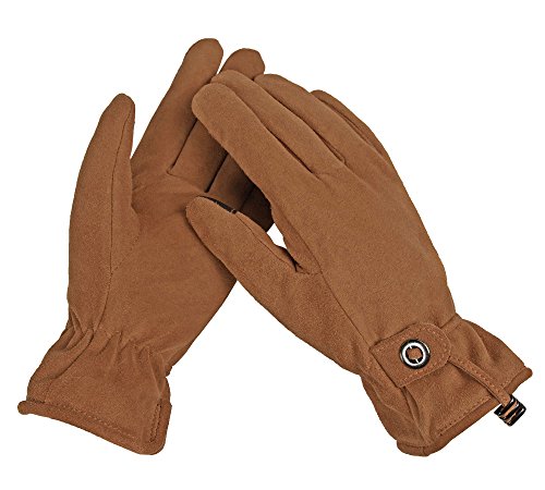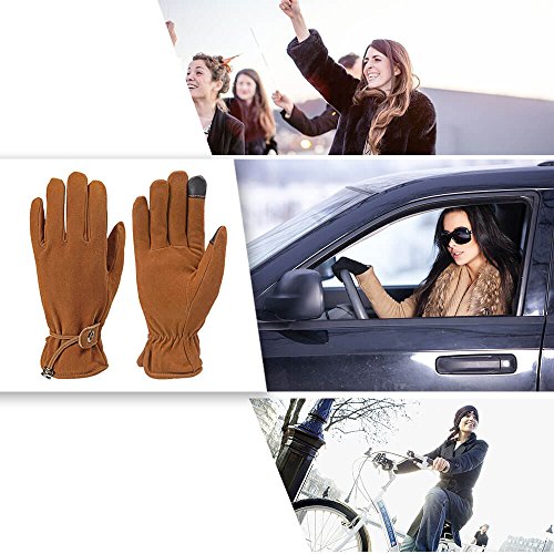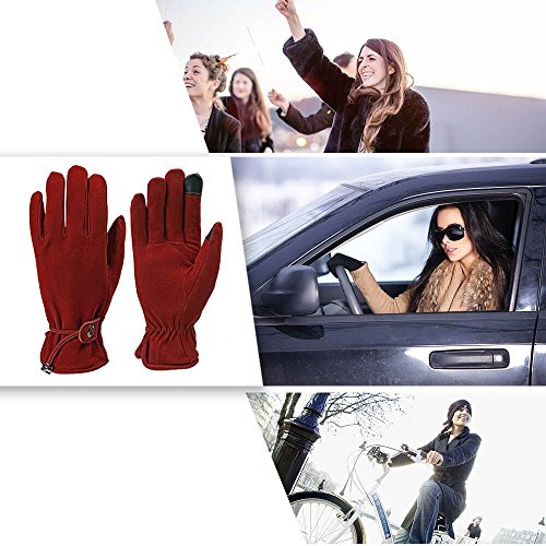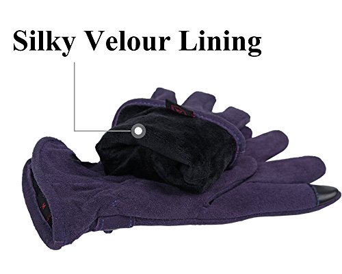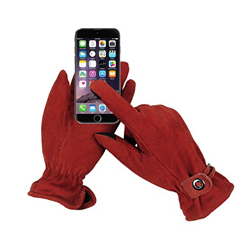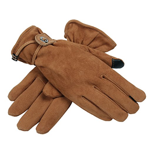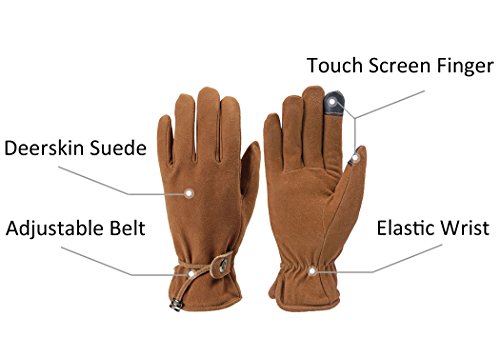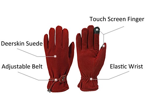 Feature:? Function: Touch Screen Fingertips and Keeping Warm in Cold Weather Application: Driving, Cycling, Riding, Golf in Winter and Keeping Warm in Cold Temperature Season: Fall and Winter Material: Genuine Deerskin?Suede Leather Shell and Smooth Velour Lining Color: Black, Purple, Brown, Red Size: Small, Medium, Large, Extra Large