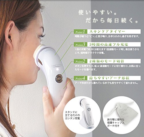 -. Feature : 【ブランド】BELLISSIMA 【サイズ】本体+ブラシ:(約)幅11.3×奥行き5.2×高さ13.5cm  本体+充電台:(約)幅11.1×奥行き7×高さ14.3cm 【重さ】本体+ブラシ:約150g / 【コード長】約1m 【音波振動】4,000回/分 【電源方式】充電式 【充電電源】入力:AC100-240V 50/60Hz  出力:DC5V 500mA 【充電時間】約3時間(室温10~35℃) / 【連続運転時間】約150分(低振動モード)  約90分(高振動モード) 【消費電力】約1.6W(充電時) 【セット内容】本体、ブラシ4種、充電台、ACアダプター、  保護キャップ、専用ポーチ / 【備考】長期間ご使用されませんと、充電池の過放電、液漏れにより、使えなくなることがあります。6ヶ月に1度は充電されることをおすすめ致します。 スキンケアタイマー   ・ひたい(約20秒)  ・鼻、あご(約20秒)  ・右頬(約10秒)  ・左頬(約10秒)  ・首、デコルテ(約20秒) すべてのお手入れが終わると、自動的に電源が切れます(約80秒後)。 / 【ご注意】適切な使用頻度は肌質、肌状態によって異なります。毎日ご使用できる方もいれば、一日おき、週に1~2回のご使用が適切な方もいらっしゃいます。使いはじめは、肌にかゆみを感じる場合もございますので、様子を見ながら使用頻度を調整して下さい。[保証期間]お買い上げから1年間