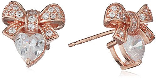 Charming 14k rose gold plated sterling silver earrings featuring heart shaped 5mm created Cubic Zirconia (CZ) stones suspended from bow studs with CZ accents