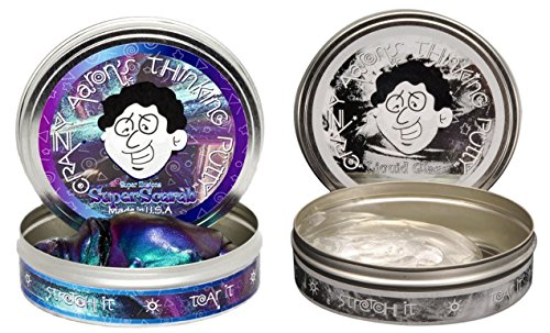 -. Binding : Toy -. Brand : Crazy Aaron's Thinking Putty -. EAN : 0739340976514 -. Feature : 2 large 4" tins of the most popular Thinking Putty! / Made in the USA / Amazing properties make this fun and educational to play with / Helps focus attention while listening -. IsAdultProduct : 0 -. Label : Crazy Aaron's Thinking Putty -. Manufacturer : Crazy Aaron's Thinking Putty -. PackageQuantity : 1 -. ProductGroup : Toy -. ProductTypeName : TOYS_AND_GAMES -. Publisher : Crazy Aaron's Thinking Putty -. Studio : Crazy Aaron's Thinking Putty -. Title : Thinking Putty 2 Pack: Liquid Glass + Super Scarab, Large 4" Tins -. UPC : 739340976514