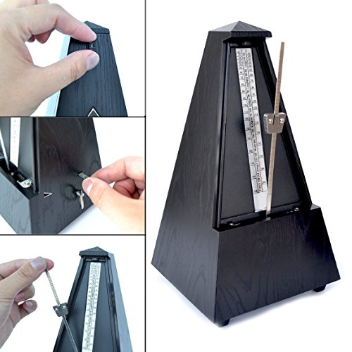Product Description 1) Turn the winding key clockwise to wind the spring inside, move the pendulum to left or right side. 2) Move the sliding weight up or down and line the and line the top at the desired tempo. 3) Switch the tone selector to 2,3,4,6, or 0 4) Slide the weight to the middle or upper part, slide the pendulum under the hook and snap the cover Specifications: * Top grade metal mechanism * Traditional beat demonstration * 40-208BPM * Tolerance < 1% * Power: Winding mechanism * Dimensions: 284(H) X 104(W) X 119(D) mm * Weight: 650g Notice: * Always put on the cover after use. * Avoid using or keeping in a dusty or damp place. * When oiling the metronome, use only the high grade watch oil. * To clean the metronome, use a soft cloth. * Never use volatile liquids or chemicals. Package includes: 1* Pyramid Mechanical Metronome 0