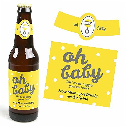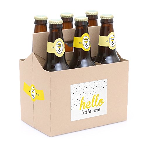 Hello Little One - Yellow and Gray - 6 Beer Bottle Labels Neutral Baby Shower with 1 Beer Carrier