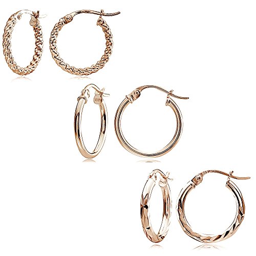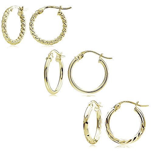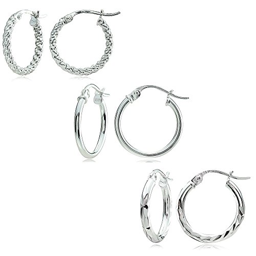 These attractive earrings showcase 3 different styles of hoops in a set of solid high polished, round diamond-cut or a braided twist. Earrings are crafted of 925 sterling silver.