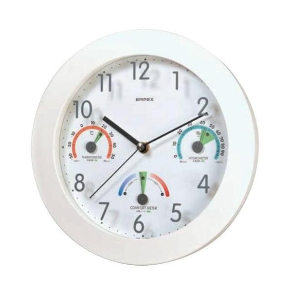 fk094igrjs温度計、湿度計、快適計、時計の4つの機能が付いています サイズ 直径約250×35mm 個装サイズ:26×26×5cm 重量 個装重量:560g 素材・材質 PS樹脂 仕様 掛け型 使用電源:単3乾電池1個 付属品 取扱説明書、保証書(保証期間:1年間)、単3乾電池1個 製造国 日本 わが家の快適ゾーンをお知らせ 温度計、湿度計、快適計、時計の4つの機能が付いています
